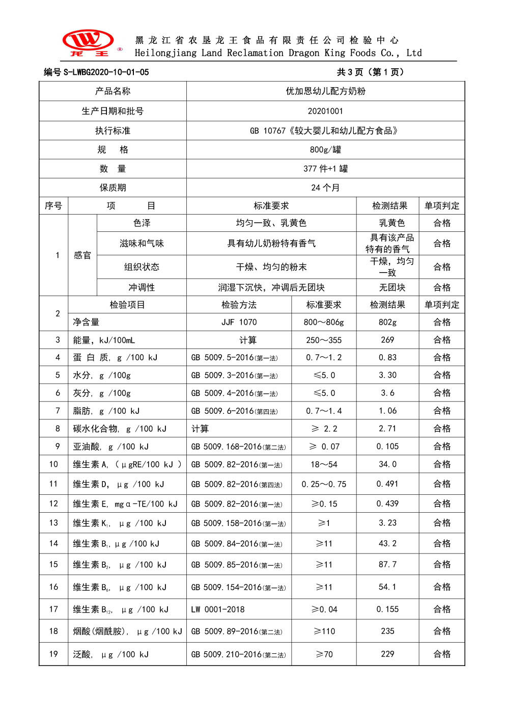 2020年(nián)10月(yuè)優加恩幼兒(ér)配方奶粉800克