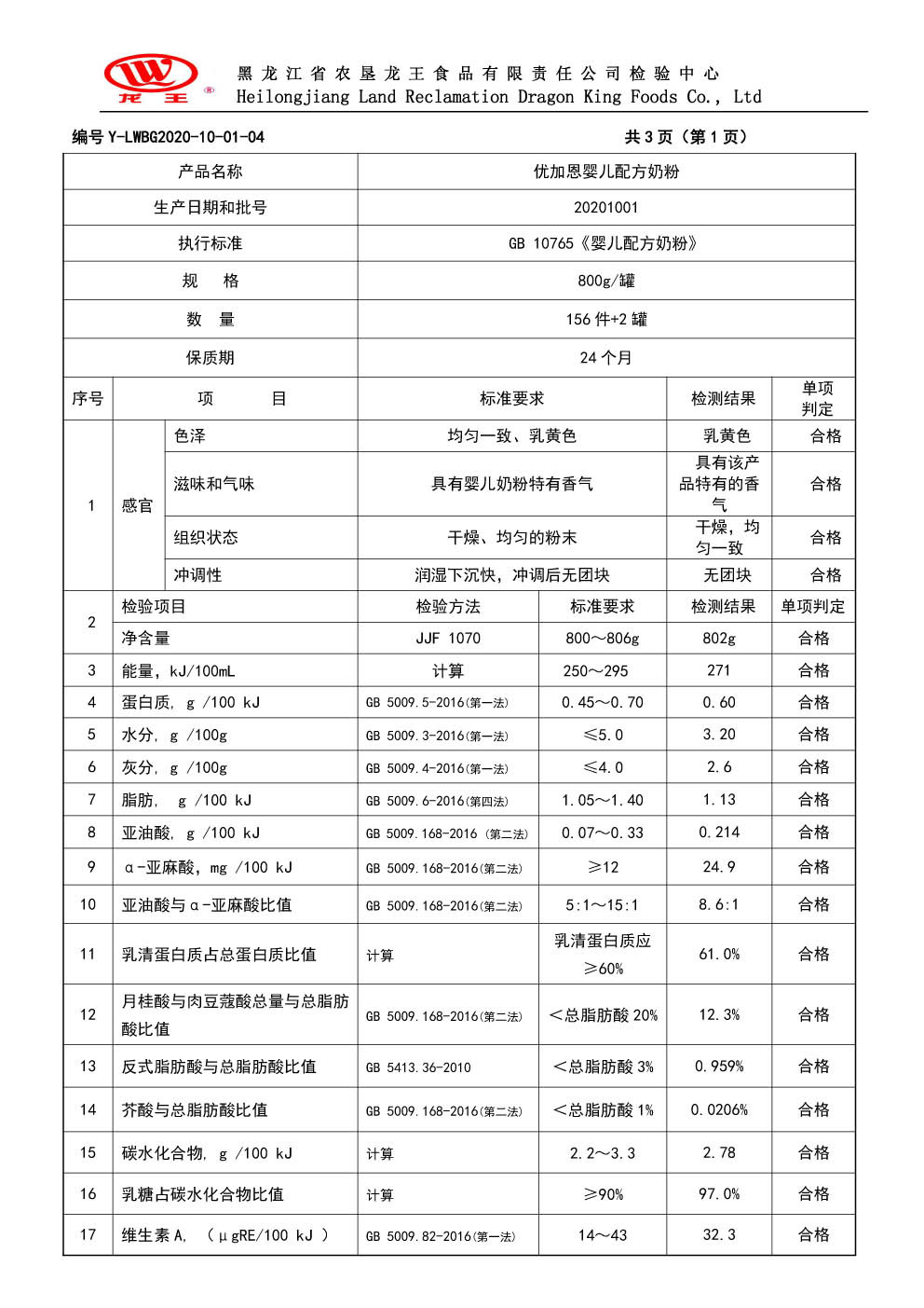 2020年(nián)10月(yuè)優加恩嬰兒(ér)配方奶粉800克