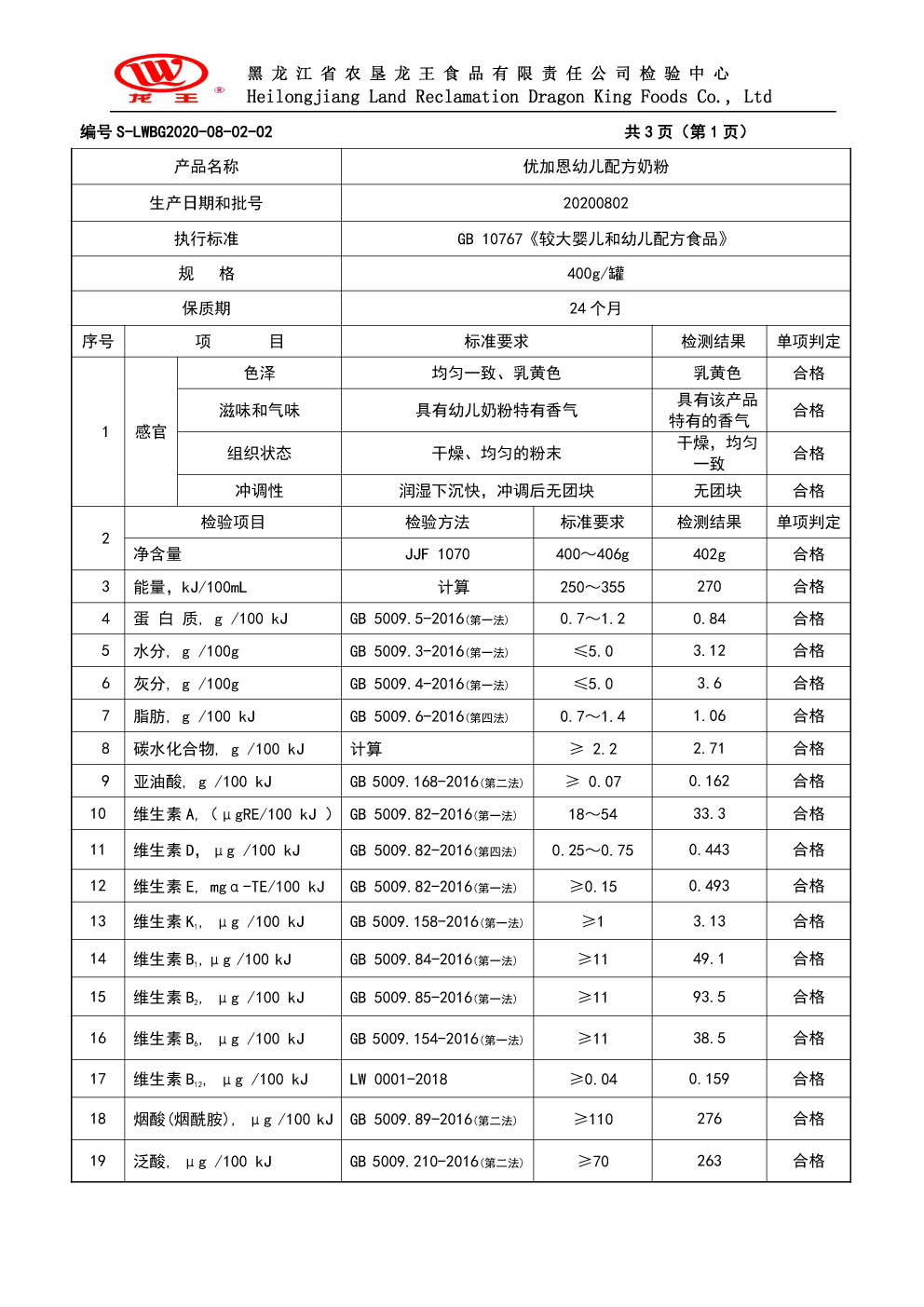 2020年(nián)8月(yuè)份優加恩幼兒(ér)配方奶粉400g