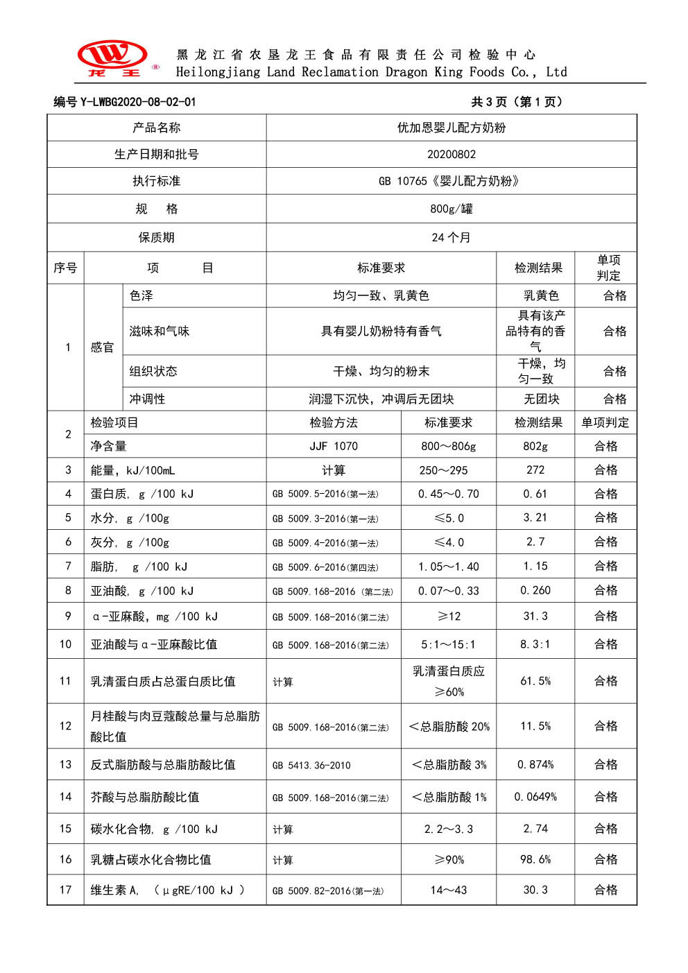 2020年(nián)8月(yuè)份優加恩嬰兒(ér)配方奶粉800g