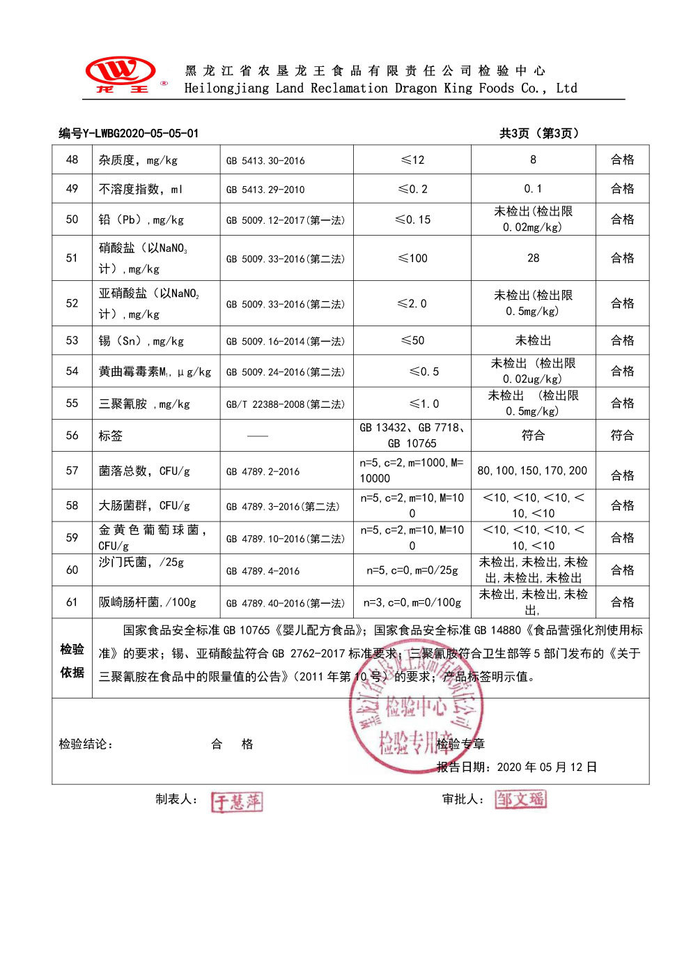 2020年(nián)5月(yuè)份龍貝樂(yuè)嬰兒(ér)配方奶粉800克
