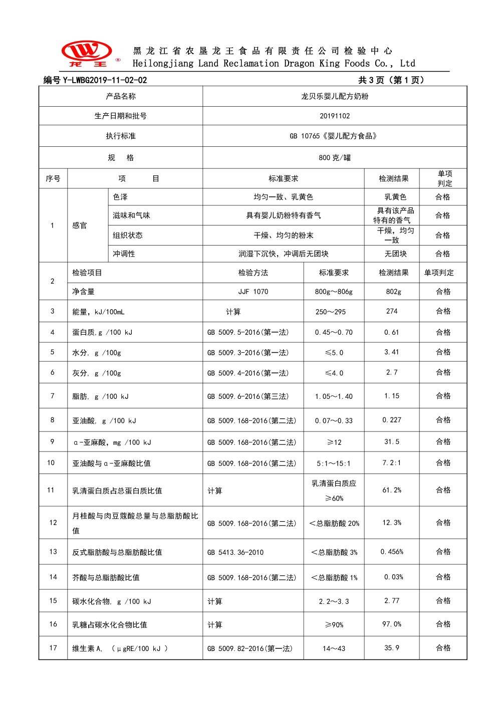 2019年(nián)11月(yuè)份龍貝樂(yuè)嬰兒(ér)配方奶粉800克