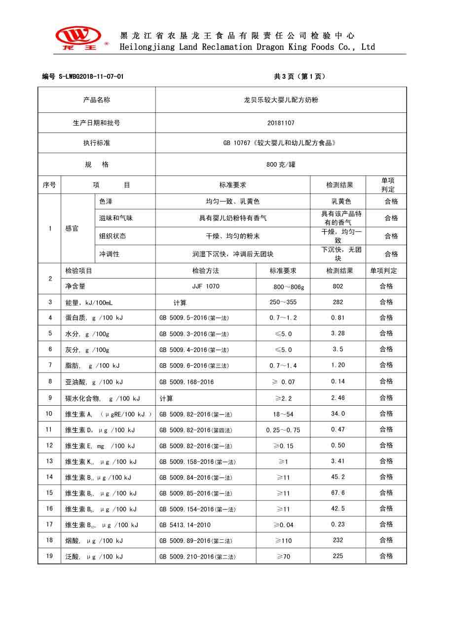 2018年(nián)11月(yuè)份龍貝樂(yuè)較大(dà)嬰兒(ér)配方奶粉800克