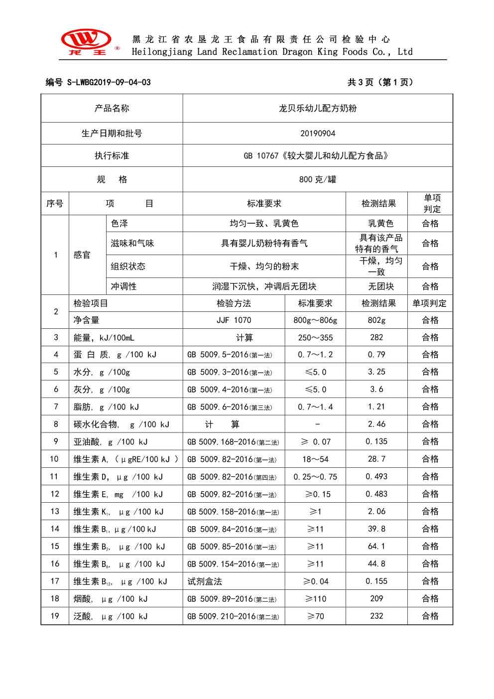 2019年(nián)9月(yuè)份龍貝樂(yuè)幼兒(ér)配方奶粉800克