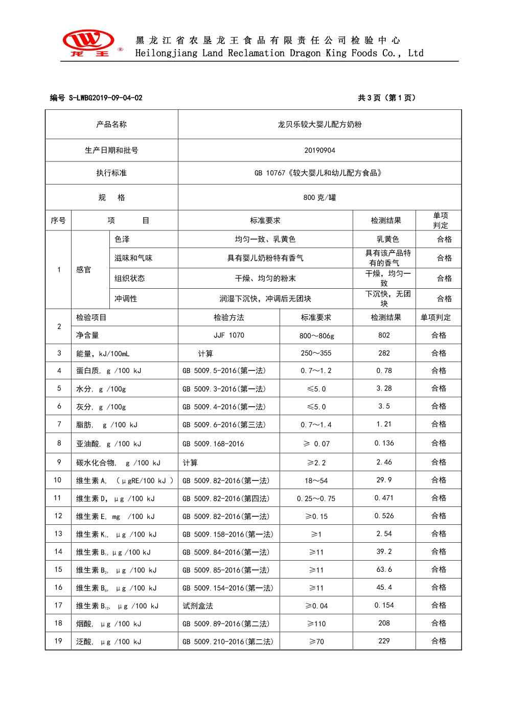 2019年(nián)9月(yuè)份龍貝樂(yuè)較大(dà)嬰兒(ér)配方奶粉800克