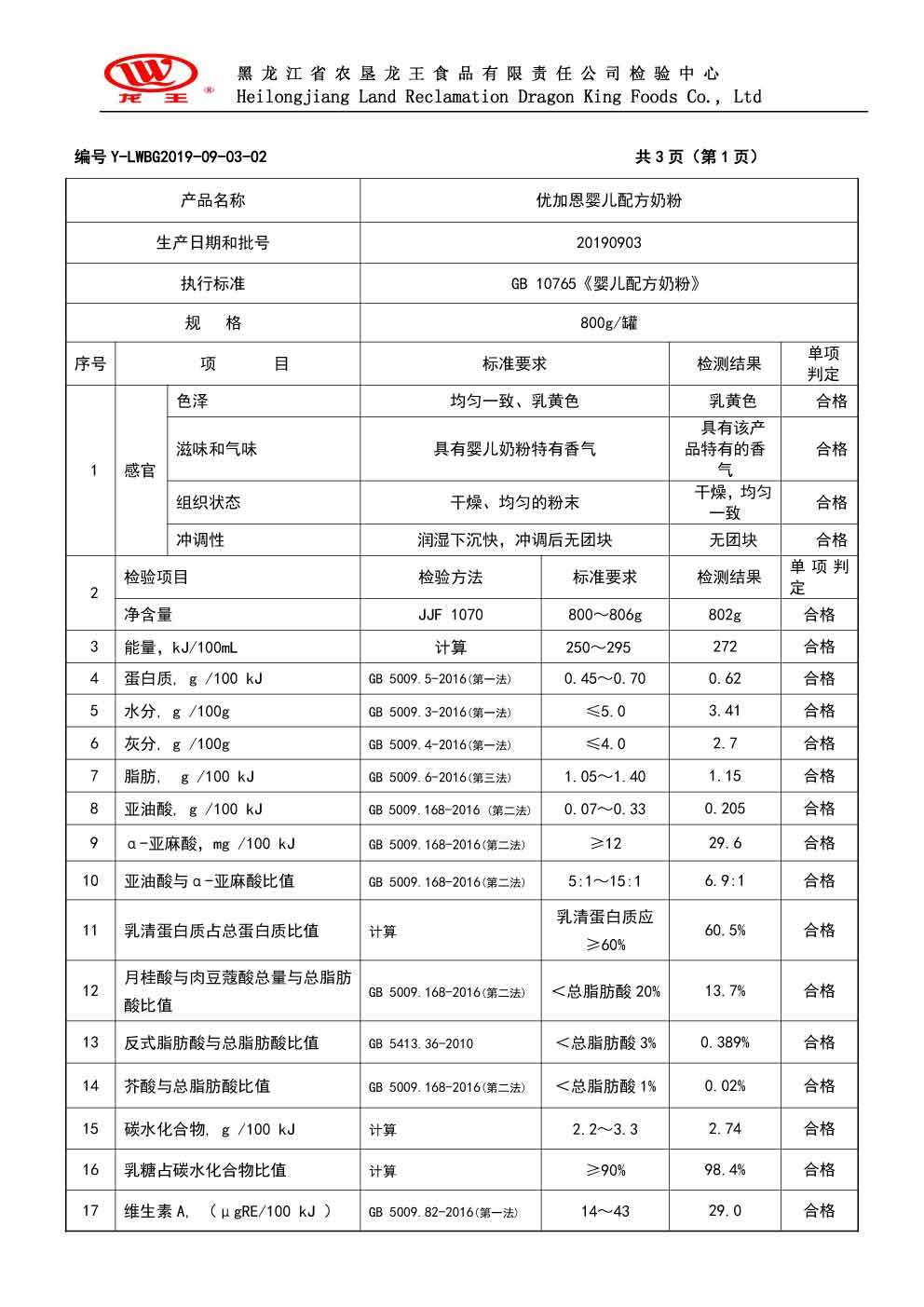 2019年(nián)9月(yuè)份優加恩嬰兒(ér)配方奶粉800克
