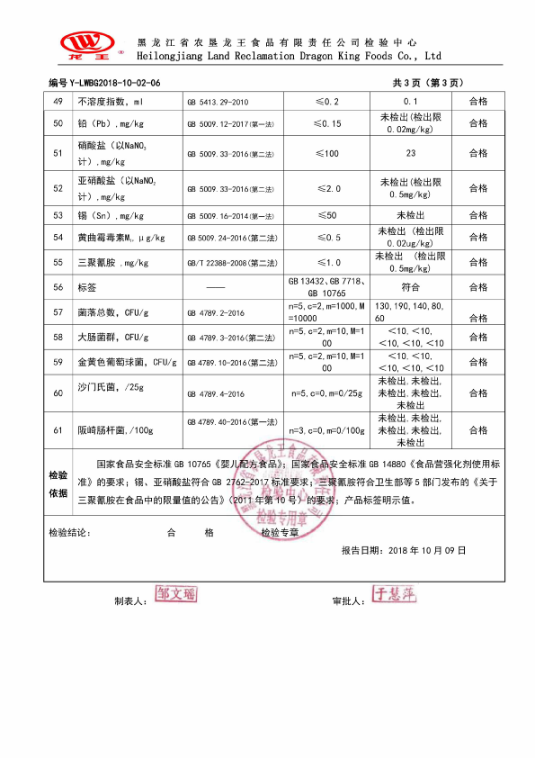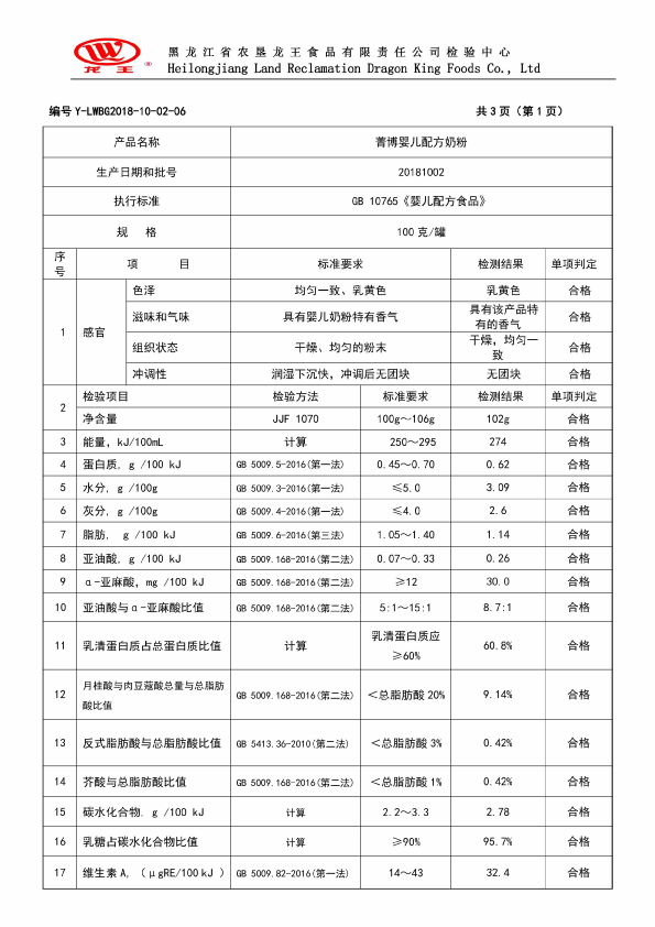 2018年(nián)10月(yuè)份優加恩嬰兒(ér)配方奶粉100克