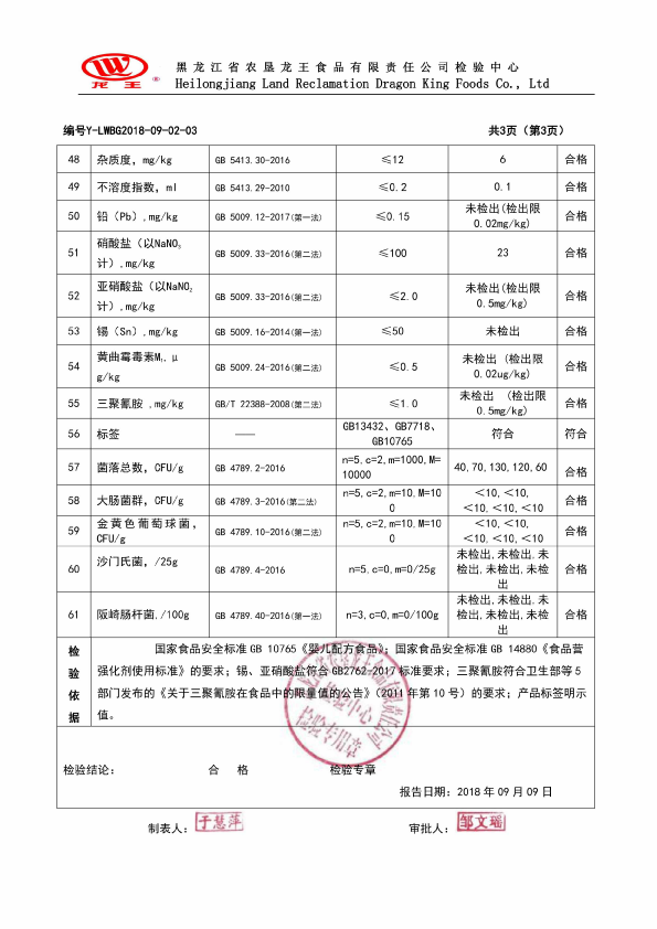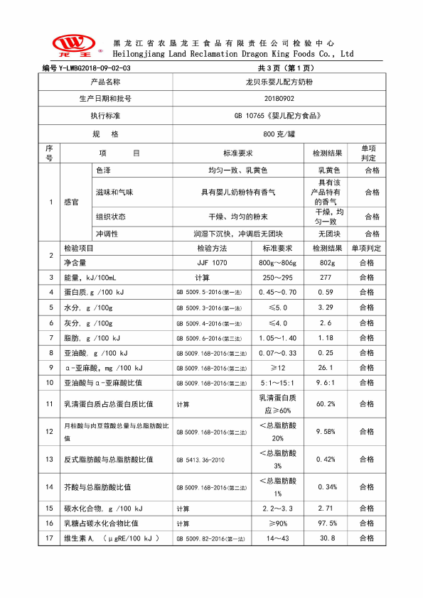2018年(nián)9月(yuè)份龍貝樂(yuè)嬰兒(ér)配方奶粉800克