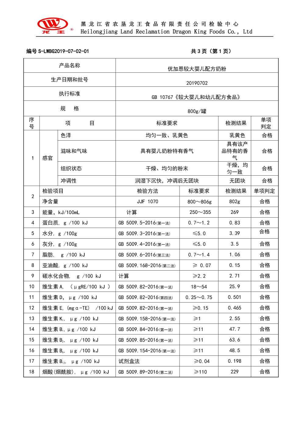 2019年(nián)7月(yuè)份優加恩較大(dà)嬰兒(ér)配方奶粉800克