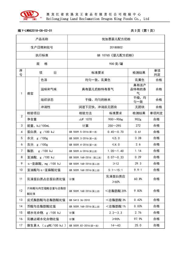 2018年(nián)8月(yuè)份優加恩嬰兒(ér)配方奶粉900克