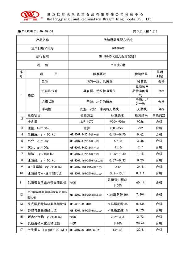 2018年(nián)7月(yuè)份優加恩嬰兒(ér)配方奶粉900克