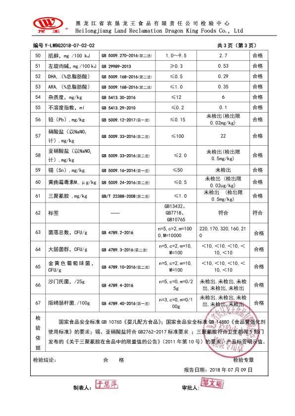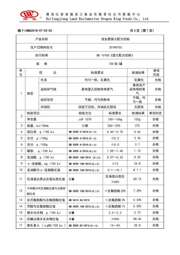 2018年(nián)7月(yuè)份優加恩嬰兒(ér)配方奶粉100克