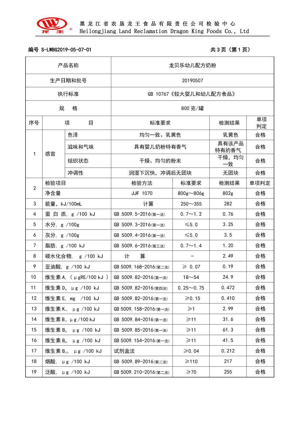 2019年(nián)5月(yuè)份龍貝樂(yuè)幼兒(ér)配方奶粉800克