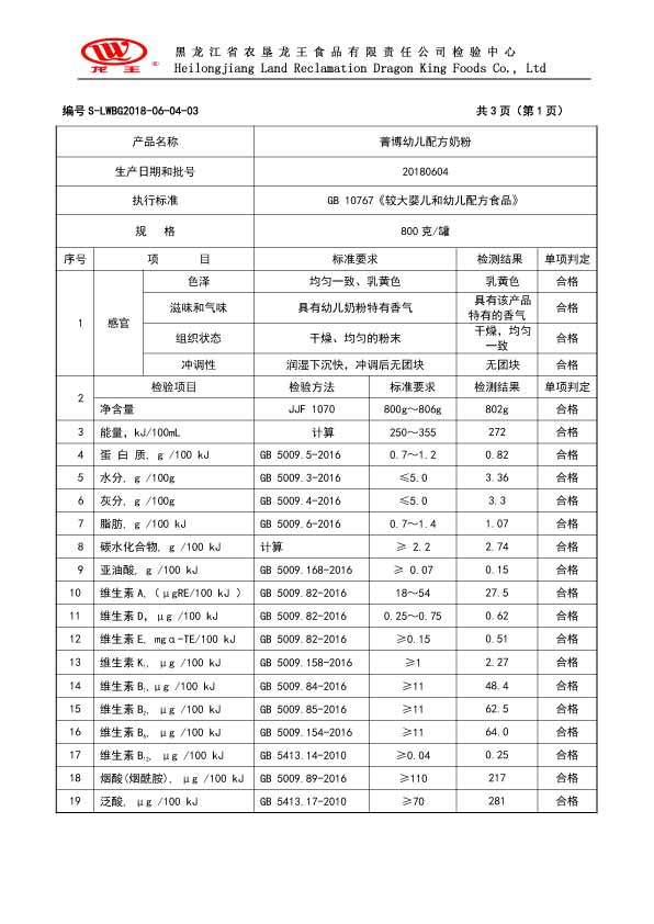 2018年(nián)6月(yuè)份菁博幼兒(ér)配方奶粉800克