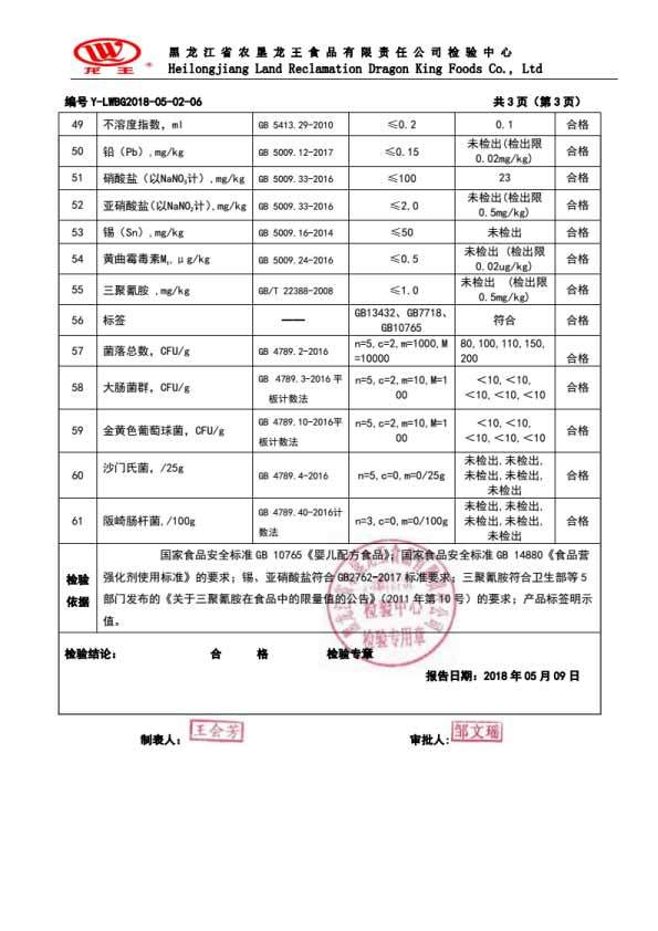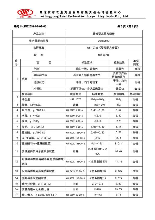 2018年(nián)5月(yuè)份菁博嬰兒(ér)配方奶粉100克