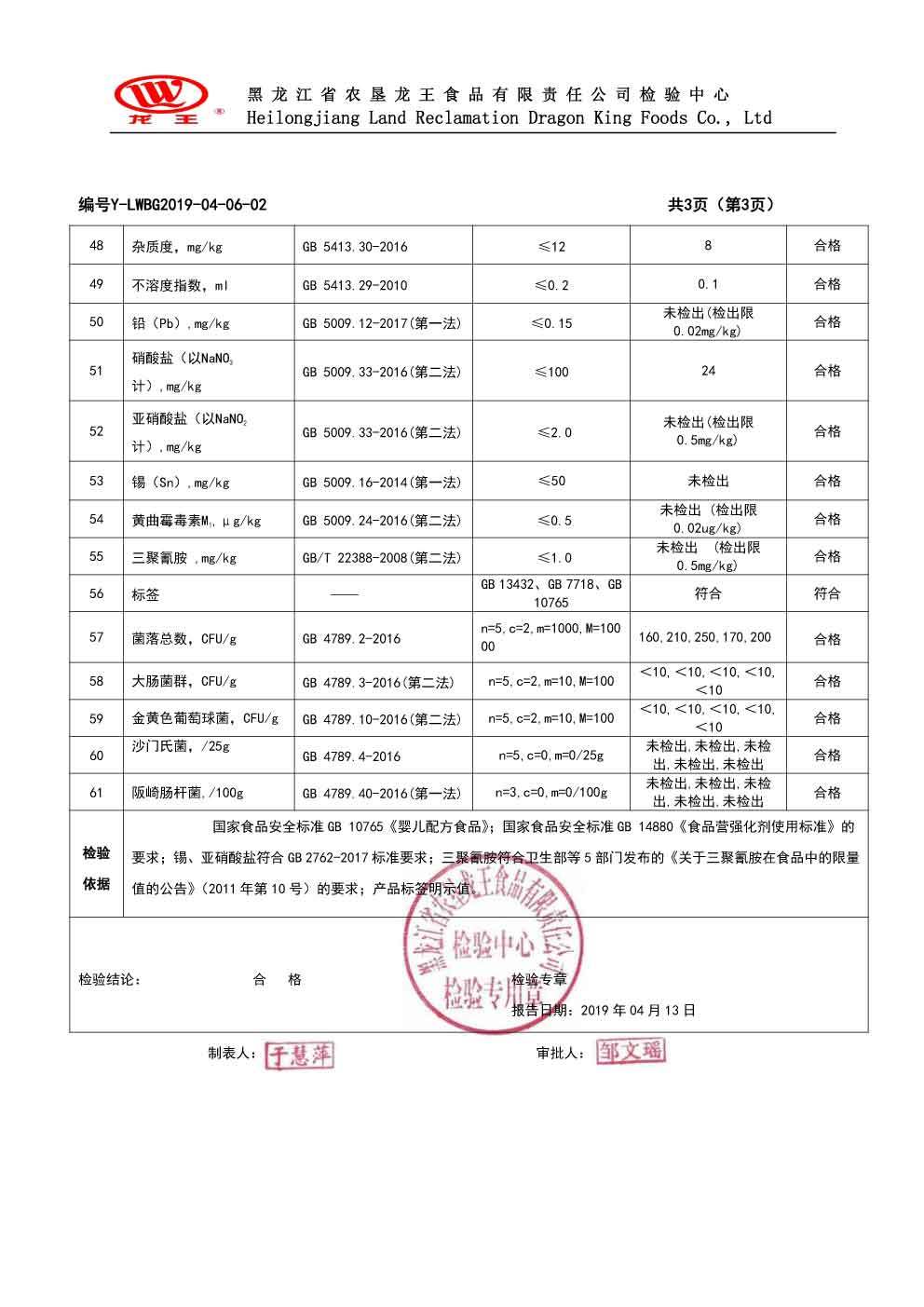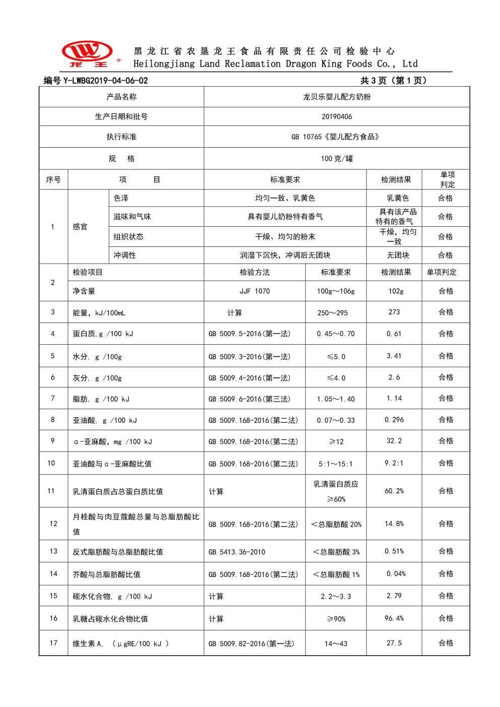 2019年(nián)4月(yuè)份龍貝樂(yuè)嬰兒(ér)配方奶粉100克