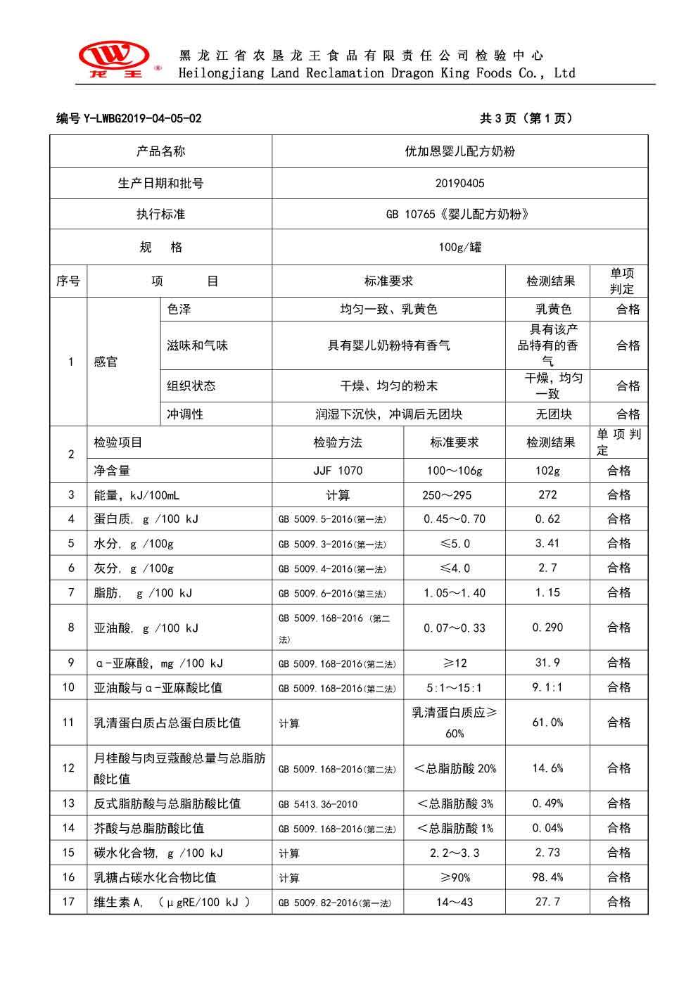 2019年(nián)4月(yuè)份優加恩嬰兒(ér)配方奶粉100克