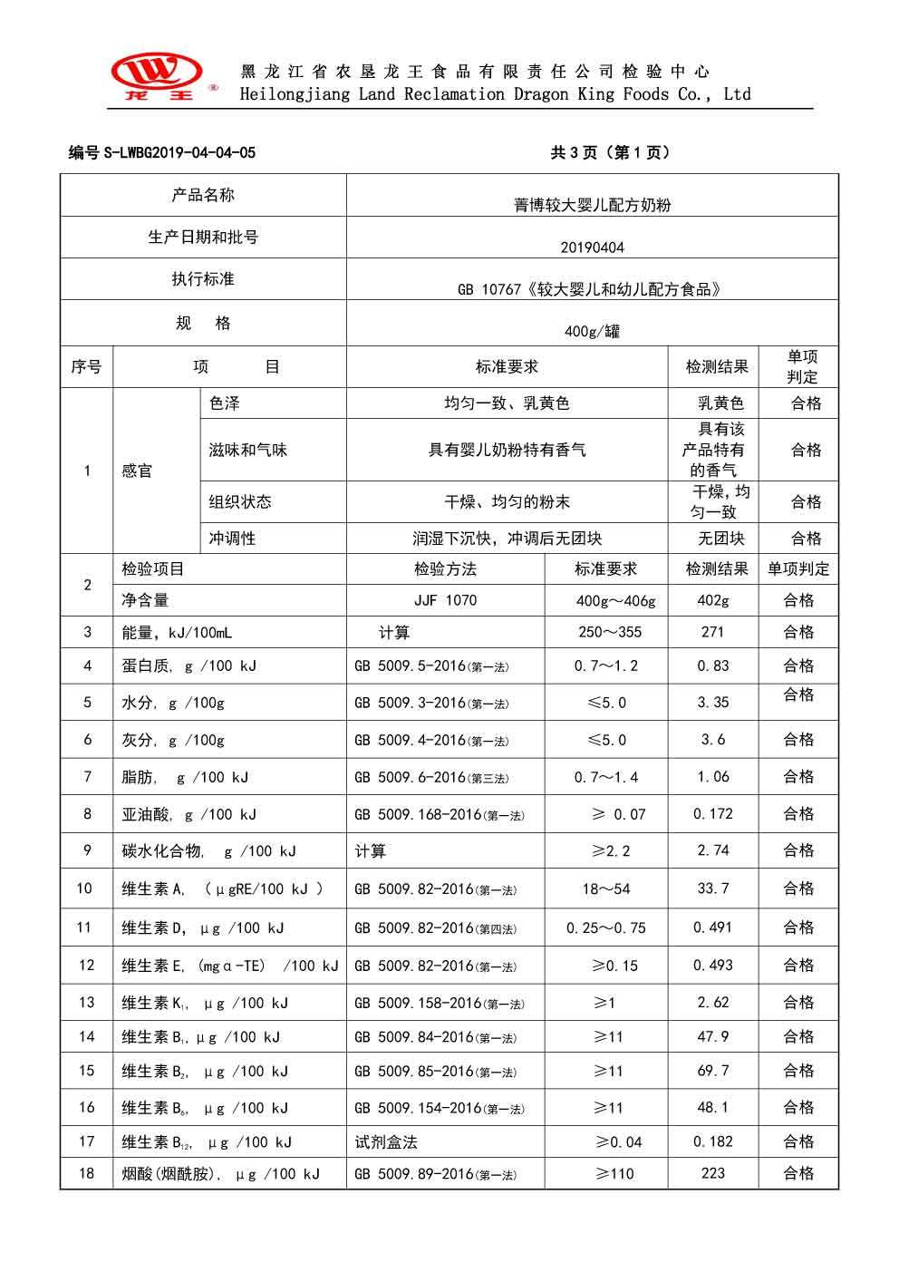 2019年(nián)4月(yuè)份菁博較大(dà)嬰兒(ér)配方奶粉400克