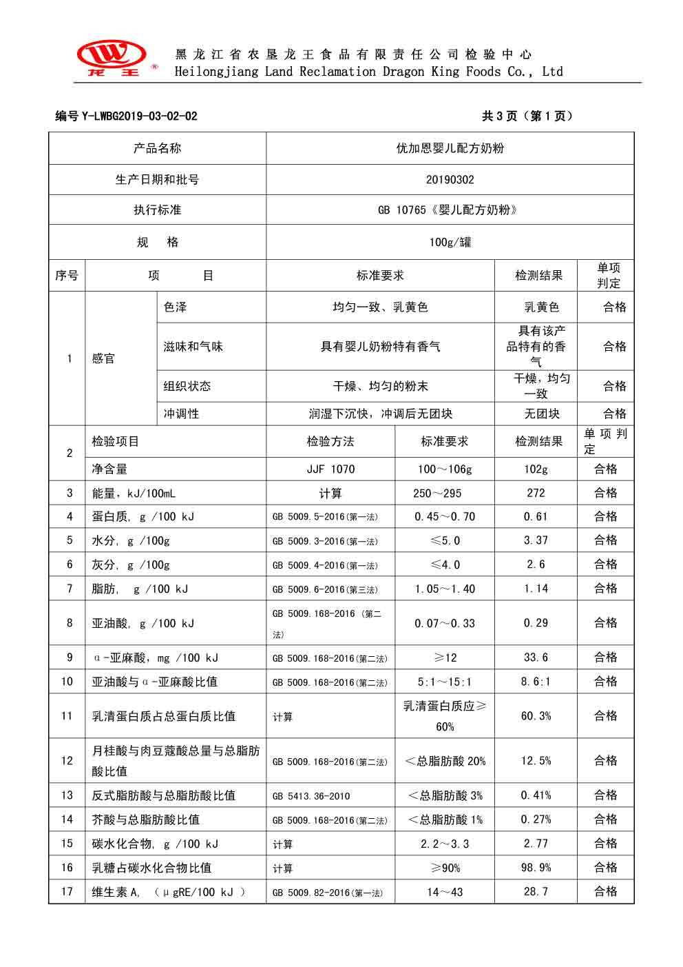 2019年(nián)3月(yuè)份優加恩嬰兒(ér)配方奶粉100克
