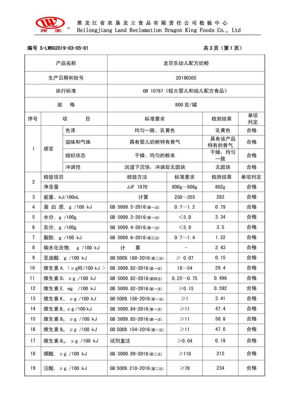 2019年(nián)3月(yuè)份龍貝樂(yuè)幼兒(ér)配方奶粉800克