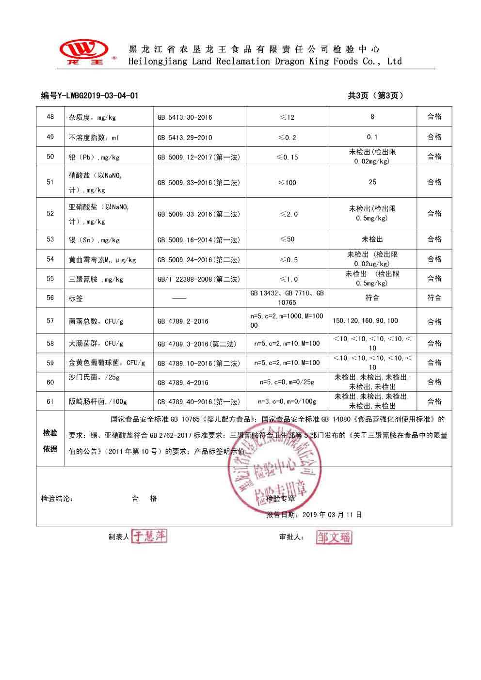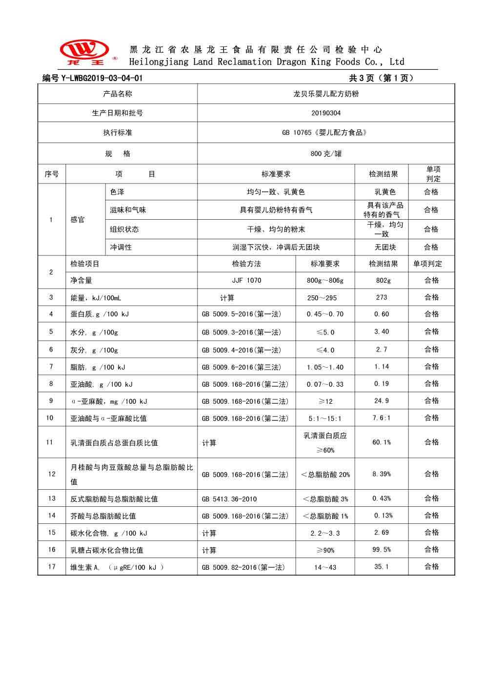 2019年(nián)3月(yuè)份龍貝樂(yuè)嬰兒(ér)配方奶粉800克