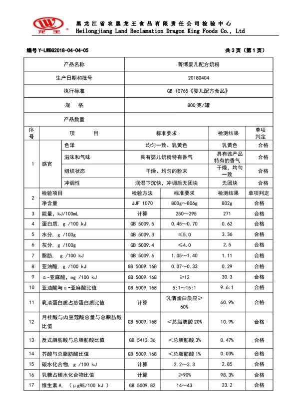 2018年(nián)4月(yuè)份菁博嬰兒(ér)配方奶粉800克