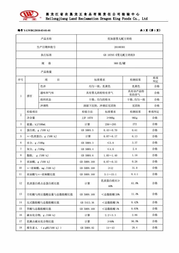 2018年(nián)3月(yuè)份優加恩嬰兒(ér)配方奶粉900克