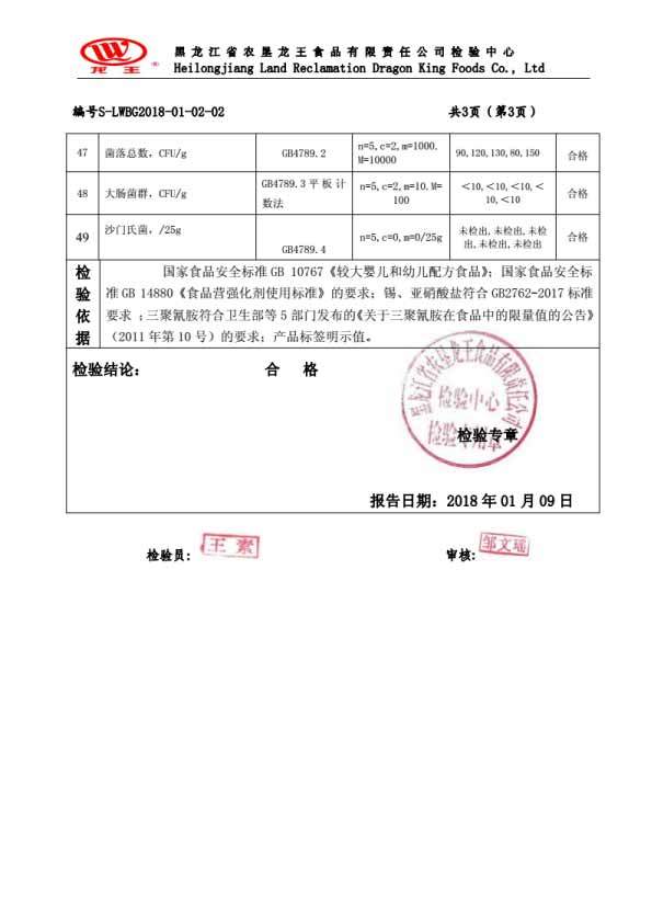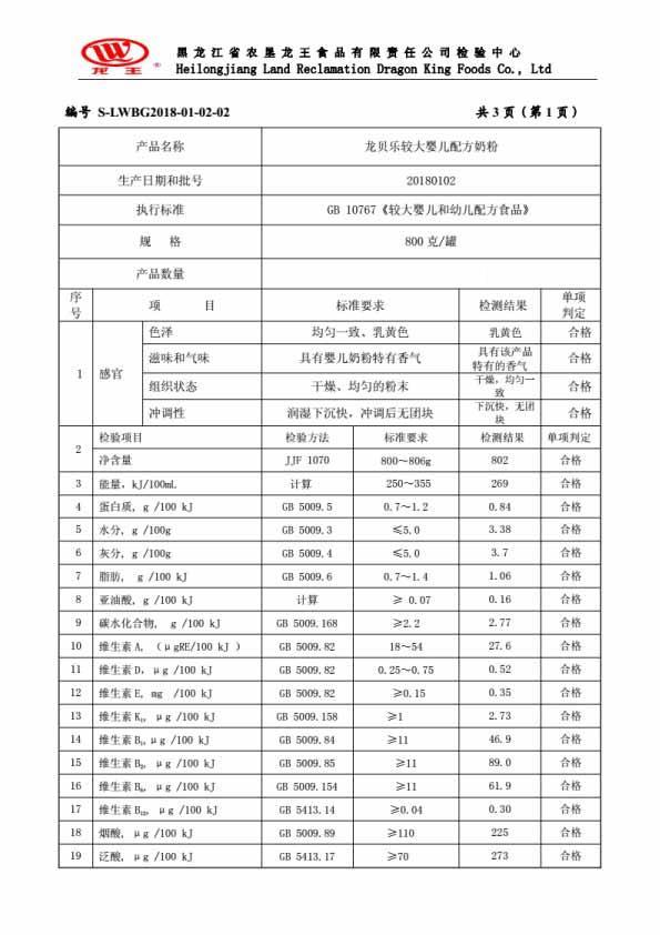2018年(nián)01月(yuè)份龍貝樂(yuè)較大(dà)嬰兒(ér)配方奶粉800克