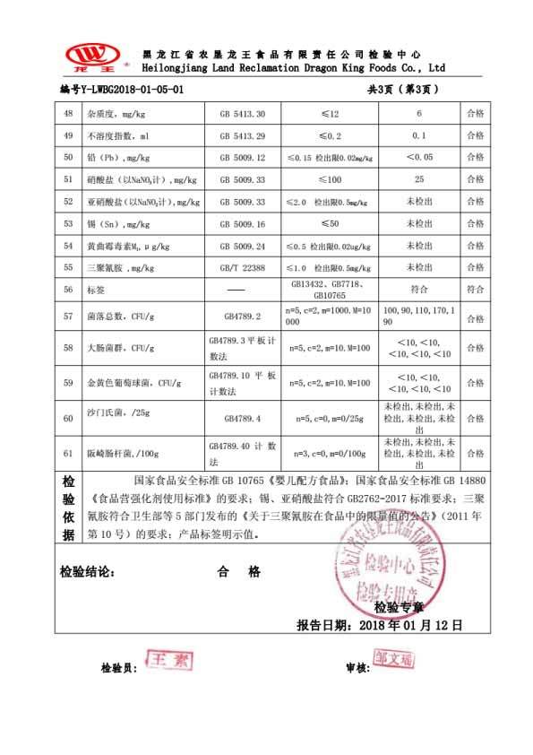 2018年(nián)01月(yuè)份龍貝樂(yuè)嬰兒(ér)配方奶粉800克