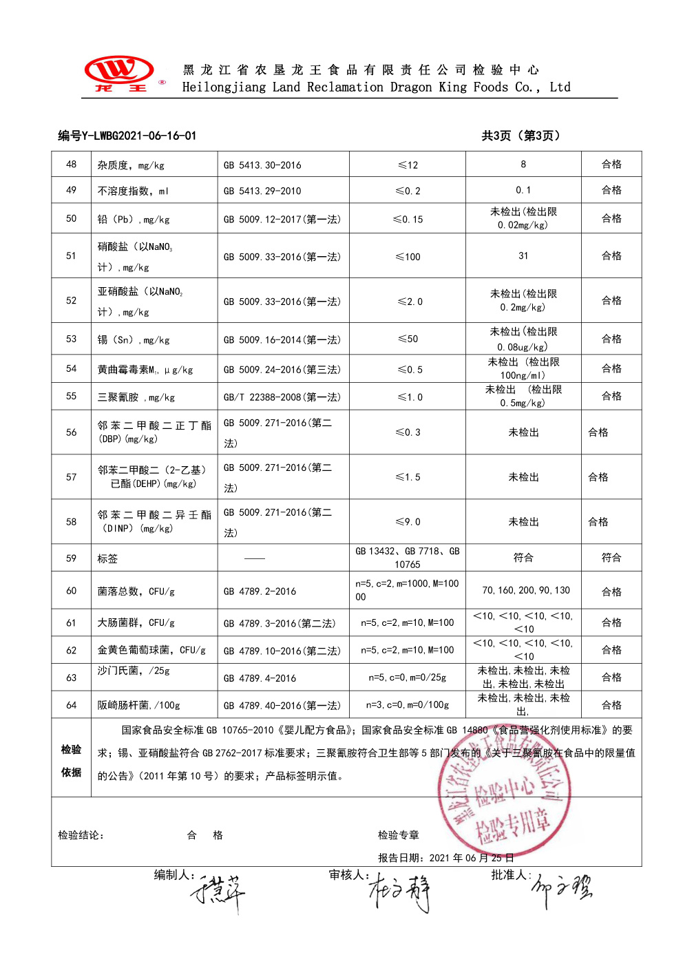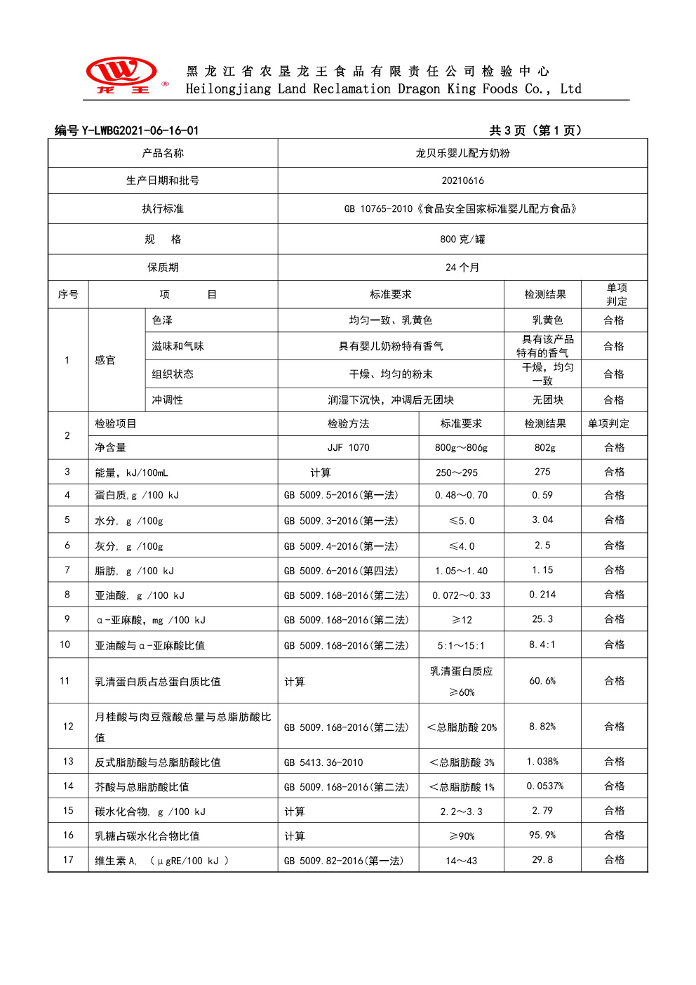 2021年(nián)6月(yuè)份龍貝樂(yuè)嬰兒(ér)配方奶粉800g